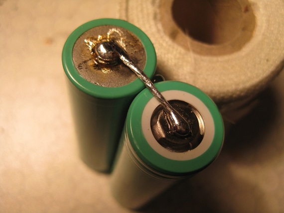 Nun auf einer Seite den Pluspol der einen Zelle mit dem Minuspol der anderen Zelle mit einem Stück Draht zusammenlöten.